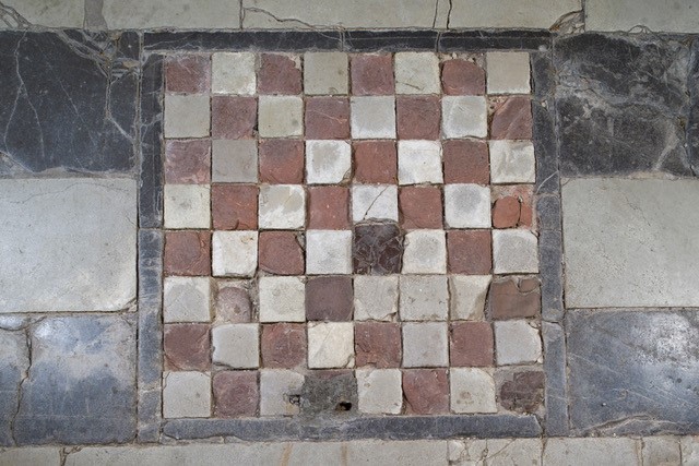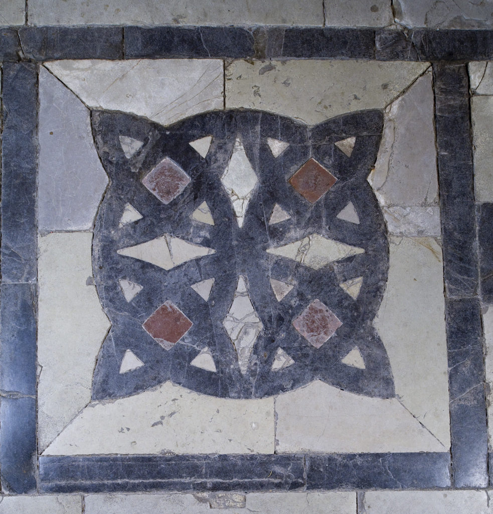 Il nostro lastricato, attribuito al XII secolo, presenta due piani pavimentali: uno originario, che dalla facciata si estende fino all’altezza delle ultime due colonne e l’altro, rialzato, che dalle ultime due colonne arriva fino al lato estremo dell’abside. Il pavimento è diviso longitudinalmente in tre zone abbastanza ben conservate. Partendo dall’ingresso, dopo due fasce di colore bianco e nero, ci imbattiamo in un quadrato costituito da piccoli quadratini bianchi e rossi disposti a scacchiera. A questo segue un’altra figura costituita dal parziale intersecarsi di nove cerchi con lo stesso raggio che danno origine ad un cerchio centrale e a molteplici losanghe. Altra figura degna di nota è quella davanti al pilastro del pulpito costituita da un quadrato nero che include una grande rota con duplice banda decorata da piccoli elementi triangolari, diversamente orientati. I colori e le diverse forme geometriche, circolari e quadrate, sono gli elementi indispensabili di un linguaggio simbolico che parla all’uomo del Medioevo e di cui noi oggi abbiamo perso il significato.